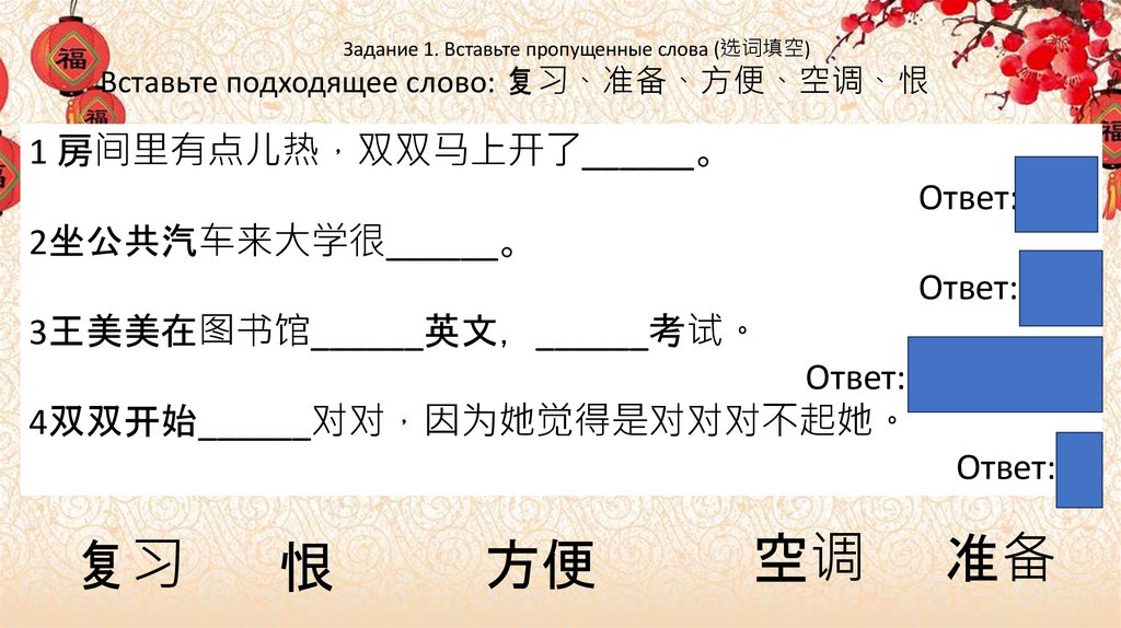 Задание 1. Вставьте пропущенные слова (选词填空)Вставьте подходящее слово: 复习、准备、方便、空调、恨