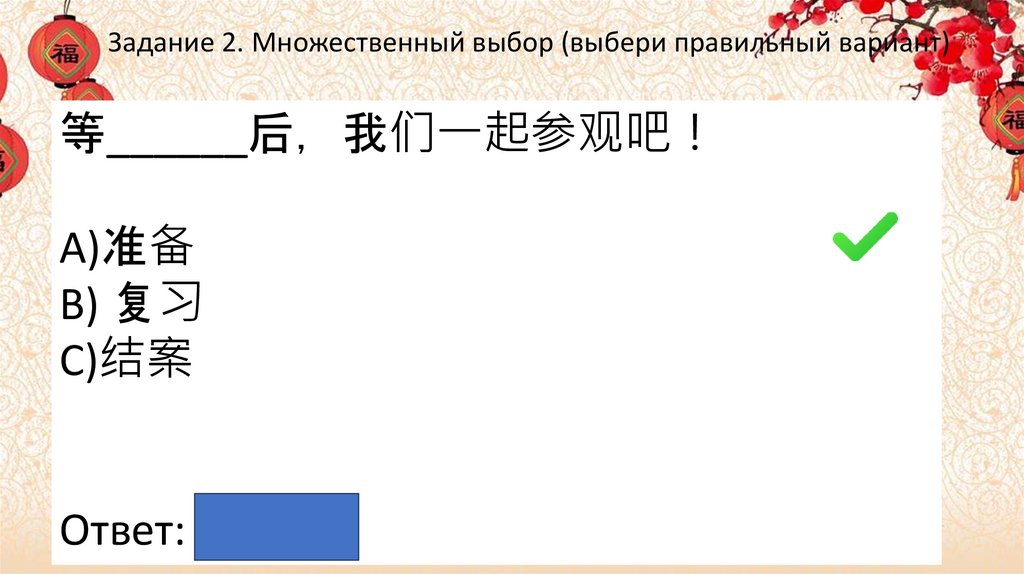 Задание 2. Множественный выбор (выбери правильный вариант)等______后 我们一起参观吧
