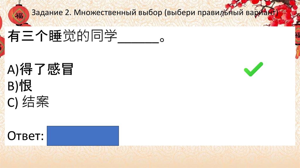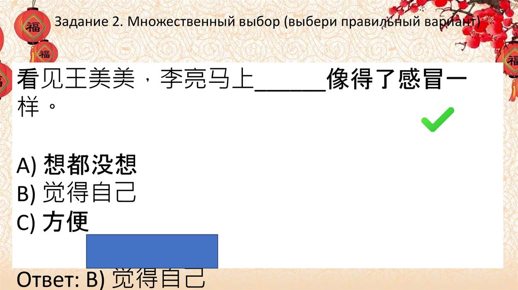 Задание 2. Множественный выбор (выбери правильный вариант)看见王美美 李亮马上______像得了感冒一