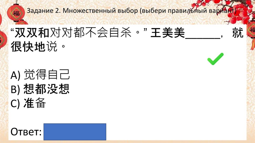 Задание 2. Множественный выбор (выбери правильный вариант)“双双和对对都不会自杀。” 王美美______ 就