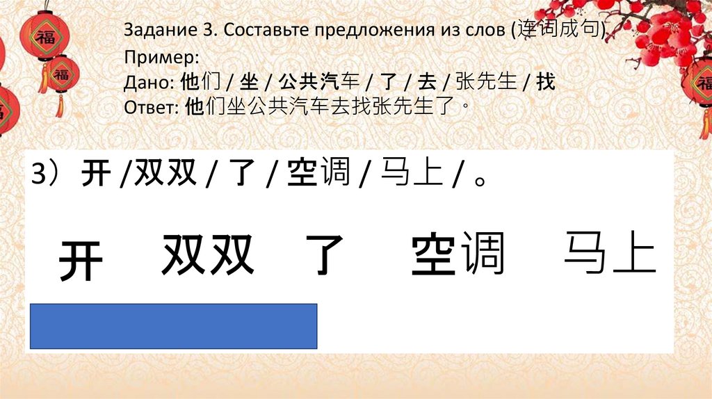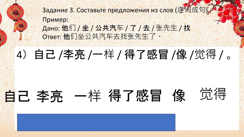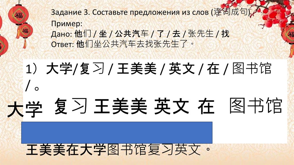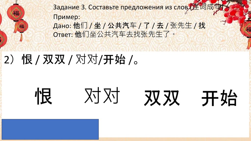 Задание 3. Составьте предложения из слов (连词成句)Пример: