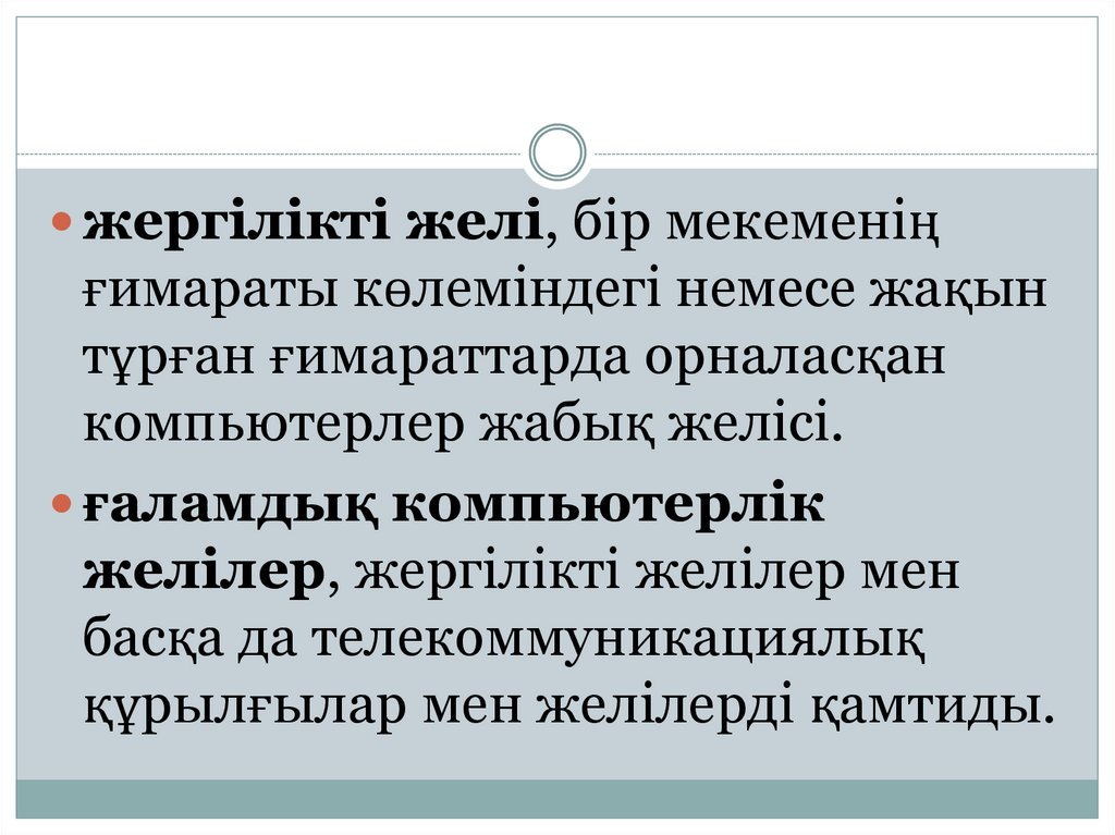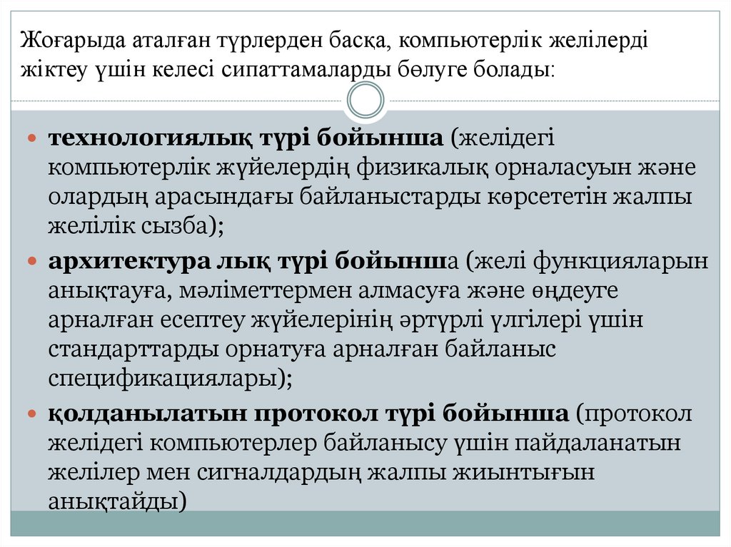 Жоғарыда аталған түрлерден басқа, компьютерлік желілердіжіктеу үшін келесі сипаттамаларды бөлуге болады: