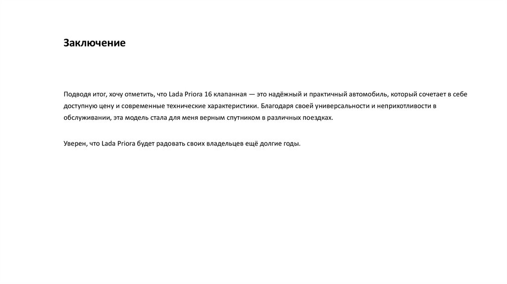 ЗаключениеПодводя итог, хочу отметить, что Lada Priora 16 клапанная — это надёжный и практичный автомобиль, который сочетает в себе