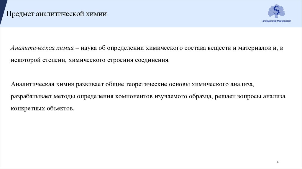 Предмет аналитической химииАналитическая химия – наука об определении химического состава веществ и материалов и, в