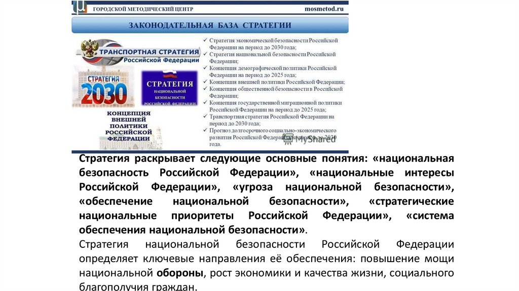 Стратегия раскрывает следующие основные понятия: «национальнаябезопасность Российской Федерации», «национальные интересы