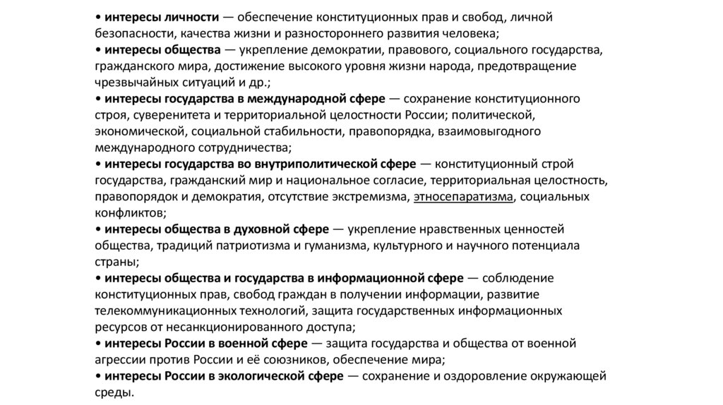 • интересы личности — обеспечение конституционных прав и свобод, личнойбезопасности, качества жизни и разностороннего развития человека;