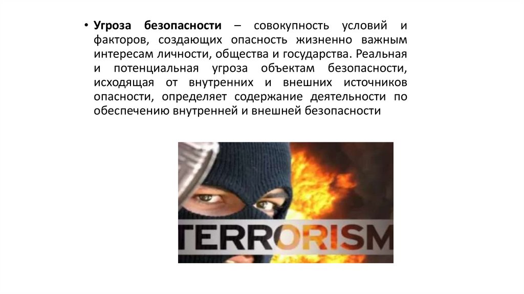 • Угроза безопасности – совокупность условий ифакторов, создающих опасность жизненно важным