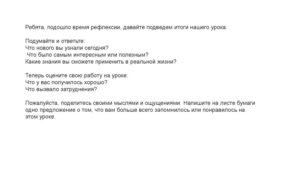 Ребята, подошло время рефлексии, давайте подведем итоги нашего урока.Подумайте и ответьте: