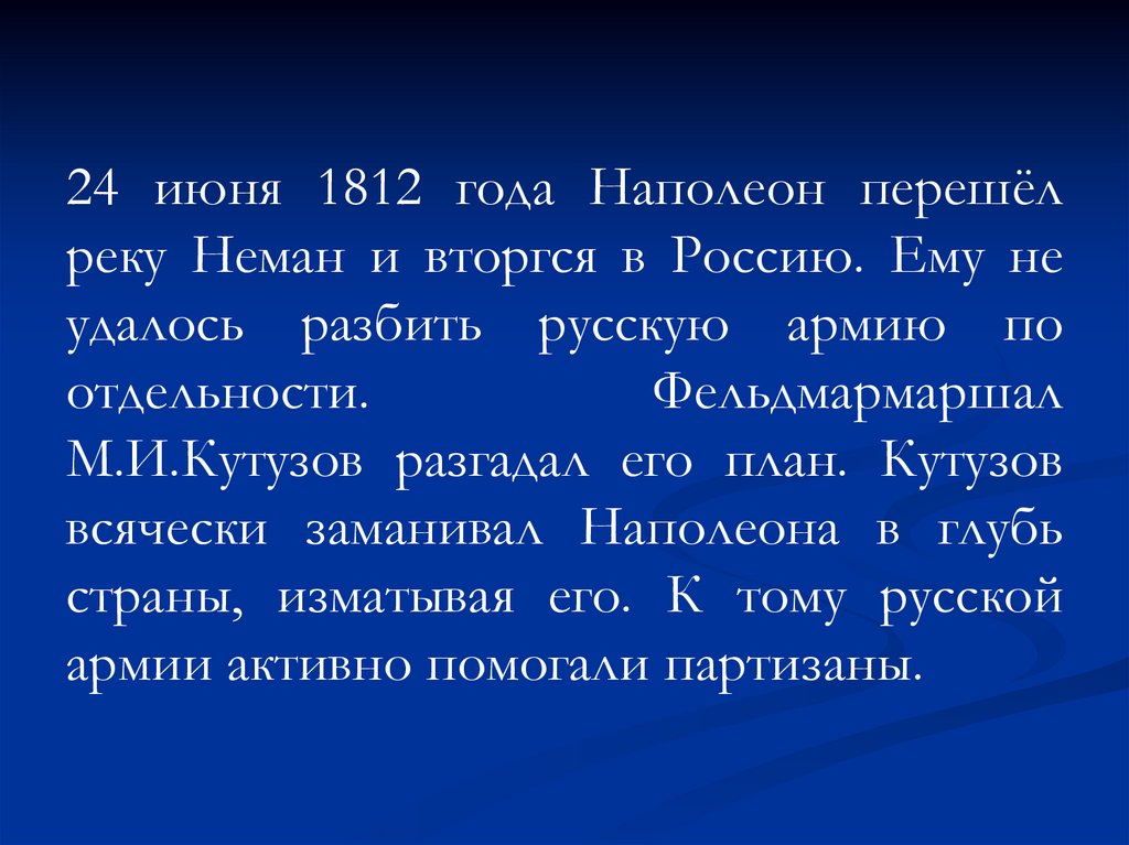 24 июня 1812 года Наполеон перешёлреку Неман и вторгся в Россию. Ему не