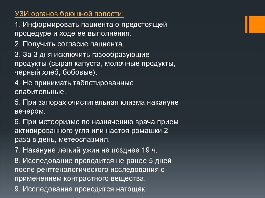 УЗИ органов брюшной полости:1. Информировать пациента о предстоящей