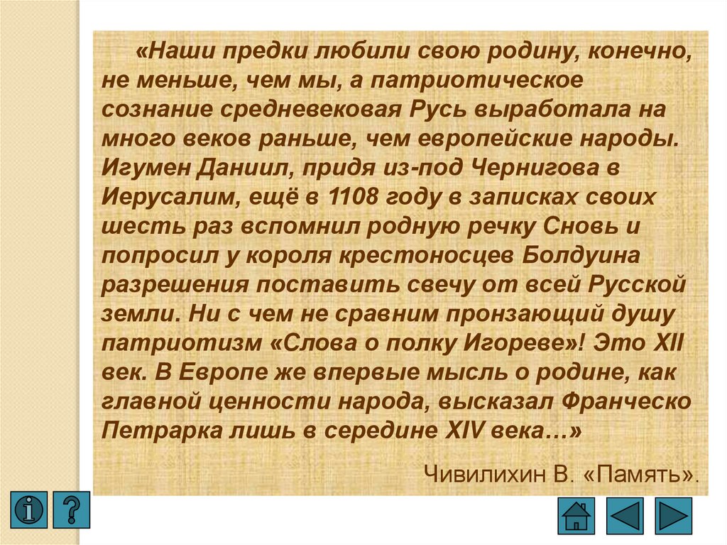 «Наши предки любили свою родину, конечно,не меньше, чем мы, а патриотическое