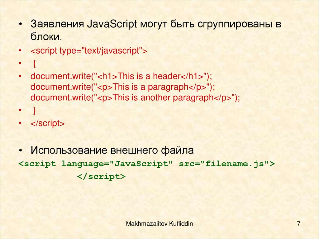 • Заявления JavaScript могут быть сгруппированы вблоки.