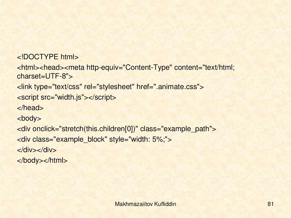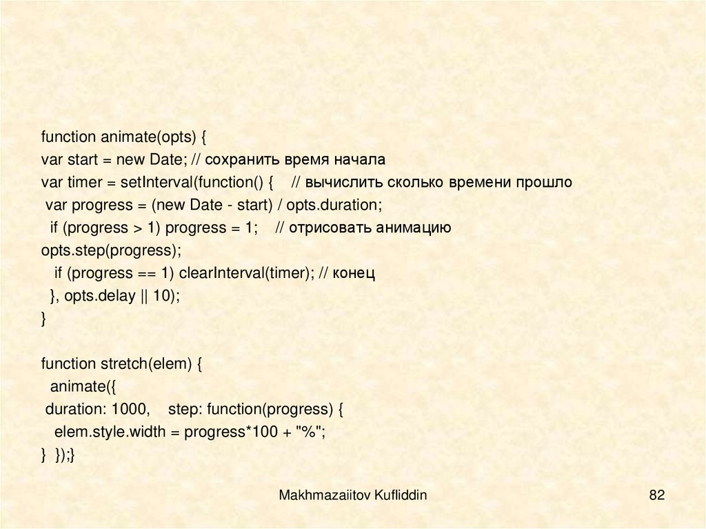 С точки зрения HTML/CSS, анимация — это постепенное изменение стиля DOM-элемента.Например, увеличение координаты style.left от 0px до 100px сдвигает элемент.
