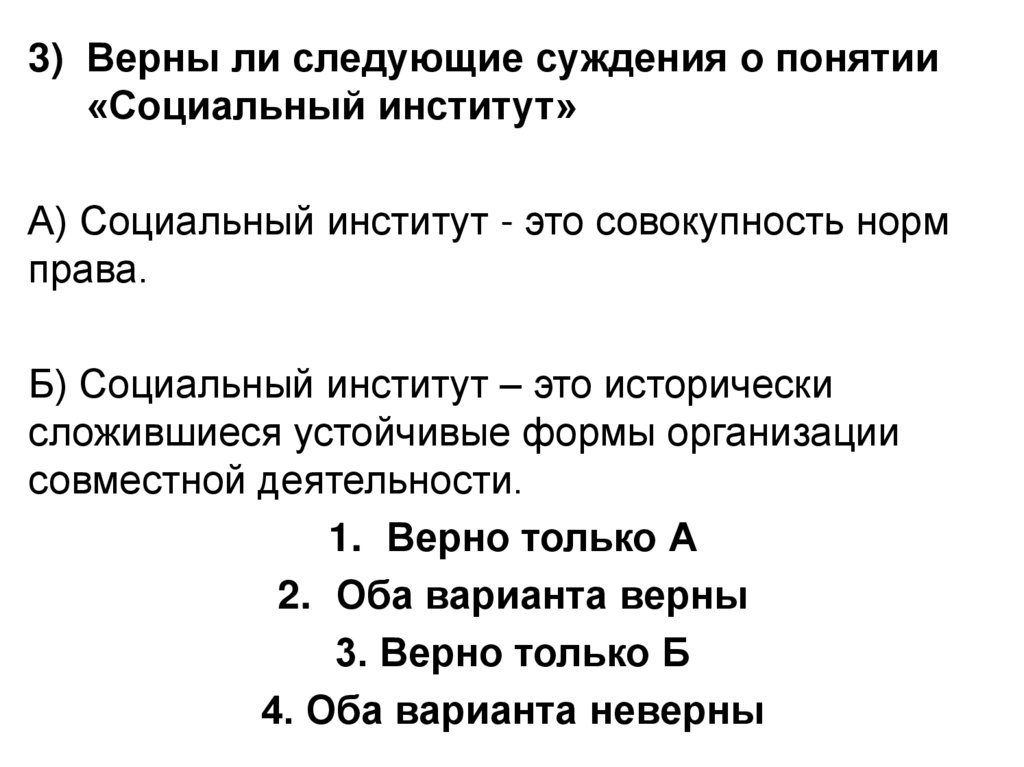 3) Верны ли следующие суждения о понятии«Социальный институт»