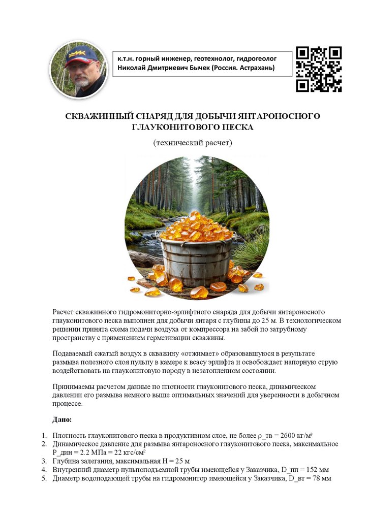 Расчет скважинного гидромониторно-эрлифтного снаряда для добычи янтароносного