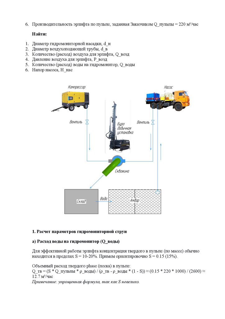 6. Производительность эрлифта по пульпе, заданная Заказчиком Q_пульпы = 220 м³/часНайти: