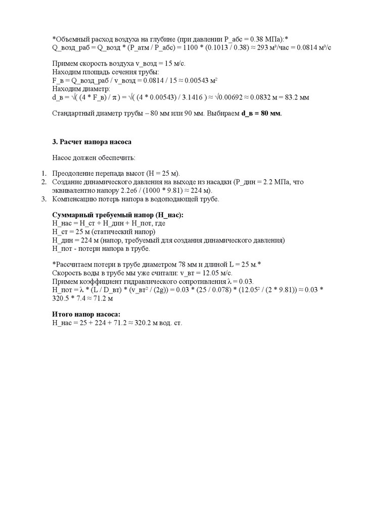*Объемный расход воздуха на глубине (при давлении P_абс = 0.38 МПа):*Q_возд_раб = Q_возд * (P_атм / P_абс) = 1100 * (0.1013 / 0.38) ≈ 293 м³/час = 0.0814 м³/с