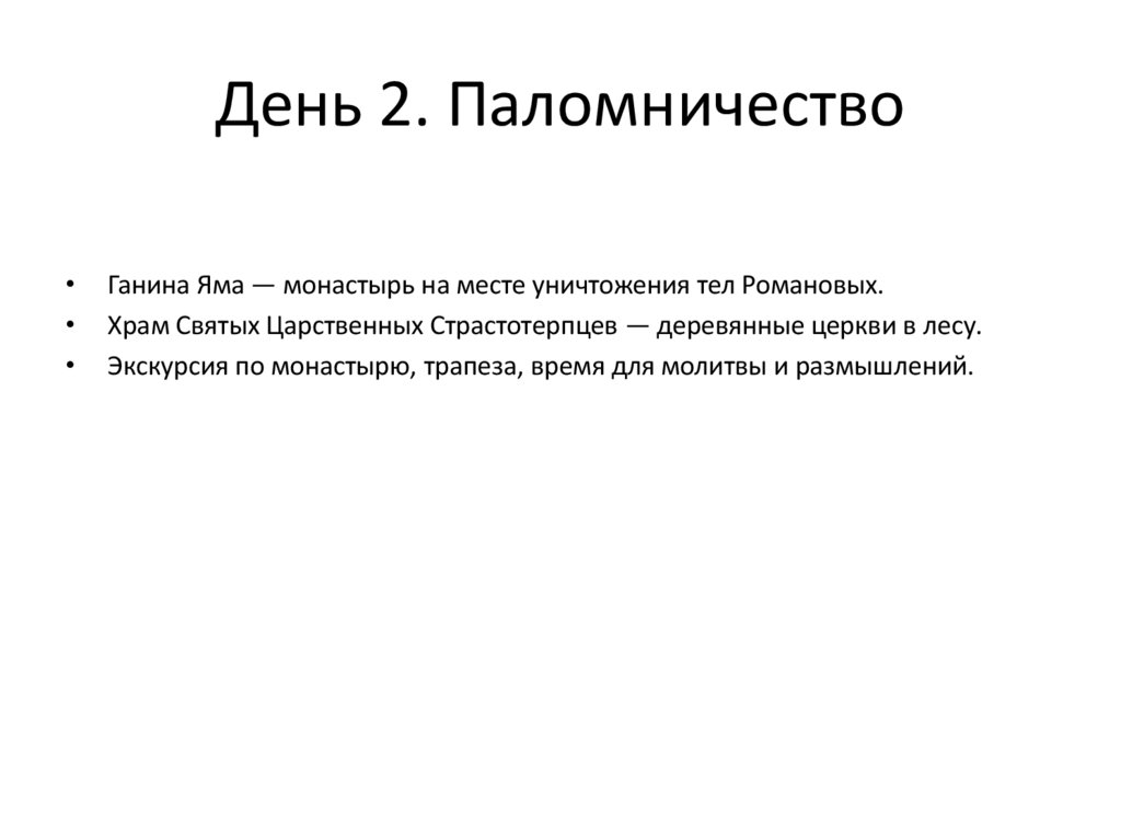 День 2. ПаломничествоГанина Яма — монастырь на месте уничтожения тел Романовых.