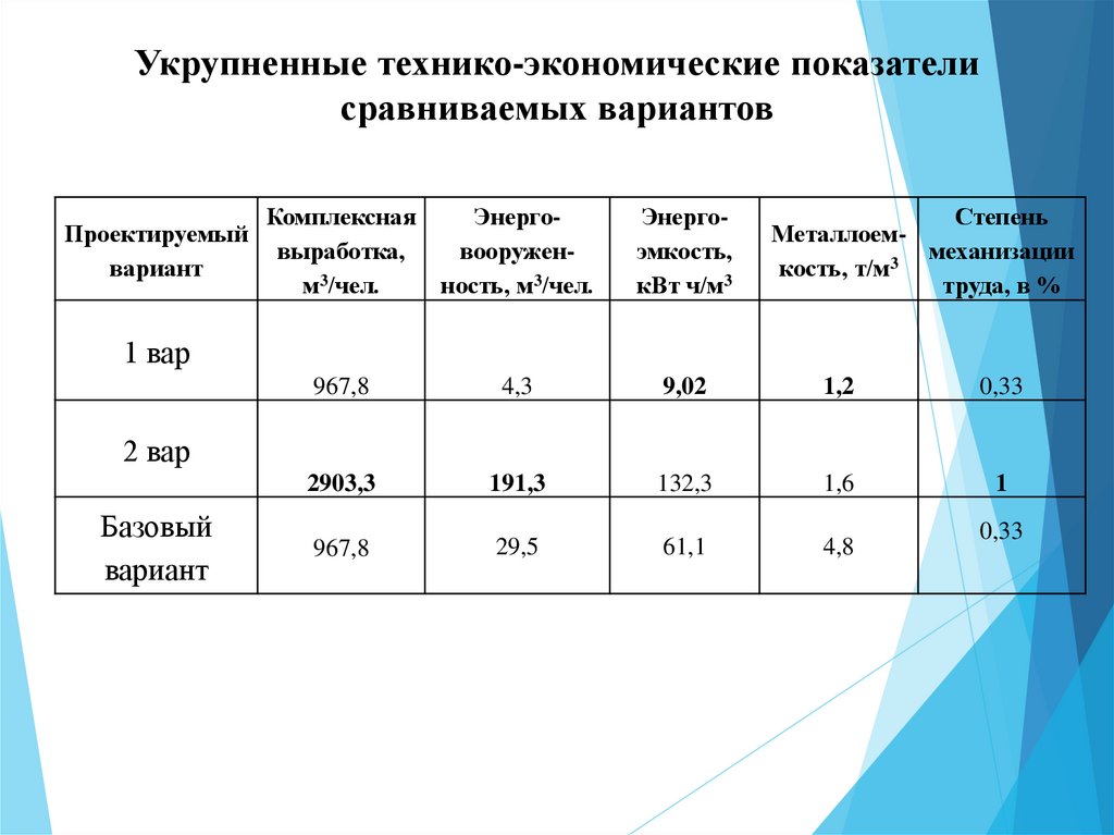 Укрупненные технико-экономические показателисравниваемых вариантов