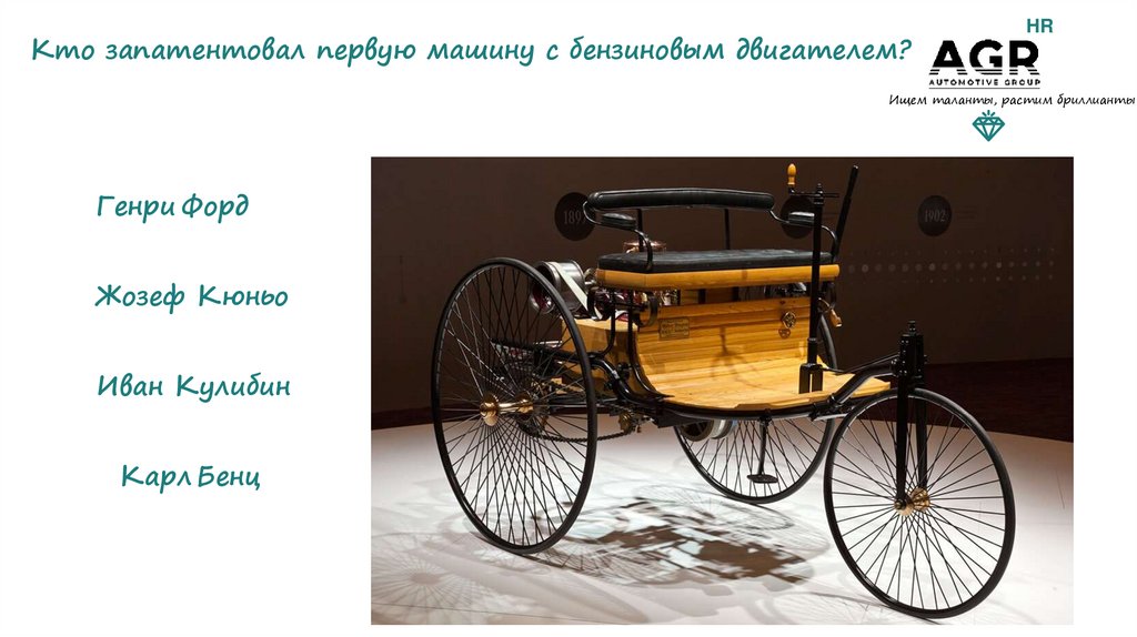 Кто запатентовал первую машину с бензиновым двигателем?HR