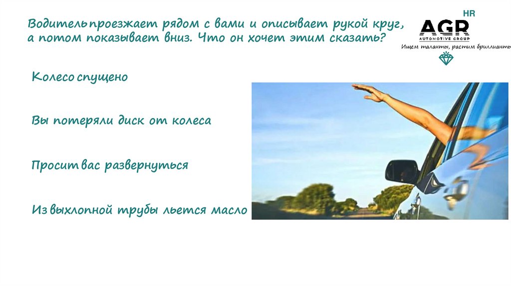 Водитель проезжает рядом с вами и описывает рукой круг,а потом показывает вниз. Что он хочет этим сказать?