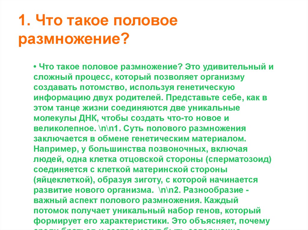 развитие нового организма. \n\n2. Разнообразие важный аспект полового размножения. Каждый