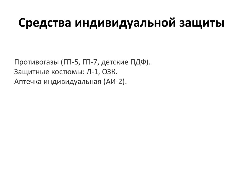 Средства индивидуальной защитыПротивогазы (ГП-5, ГП-7, детские ПДФ).