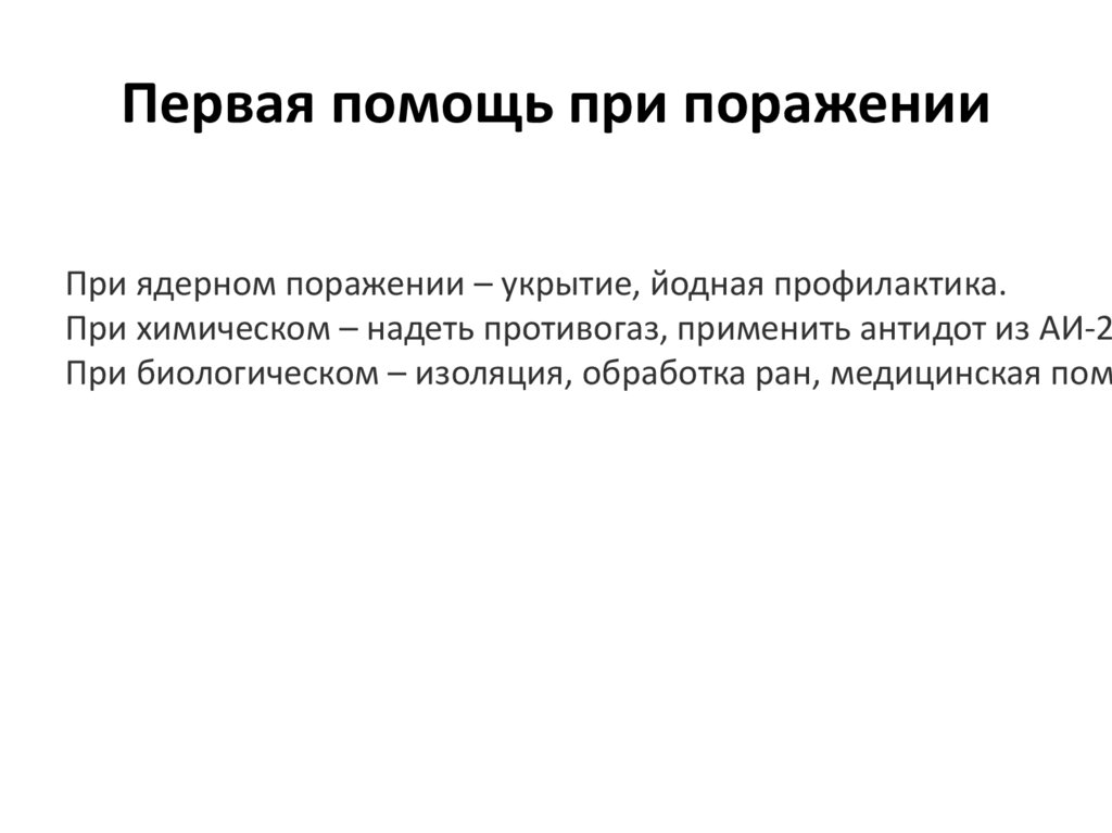Первая помощь при пораженииПри ядерном поражении – укрытие, йодная профилактика.
