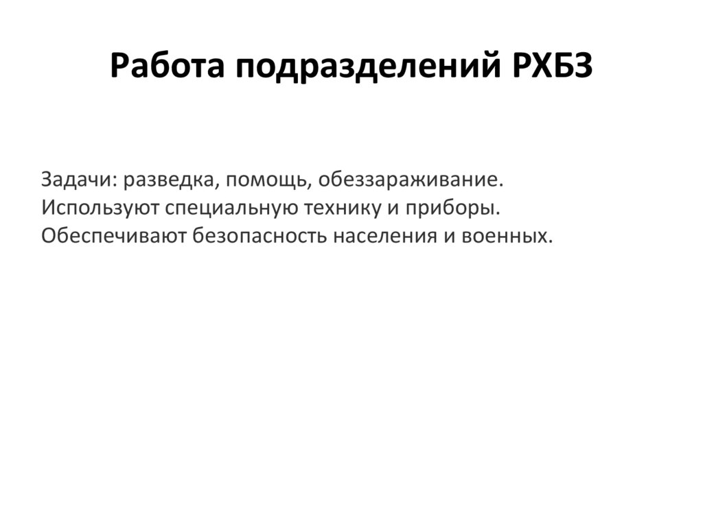 Работа подразделений РХБЗЗадачи: разведка, помощь, обеззараживание.