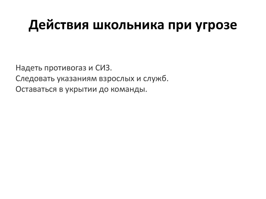Действия школьника при угрозеНадеть противогаз и СИЗ.