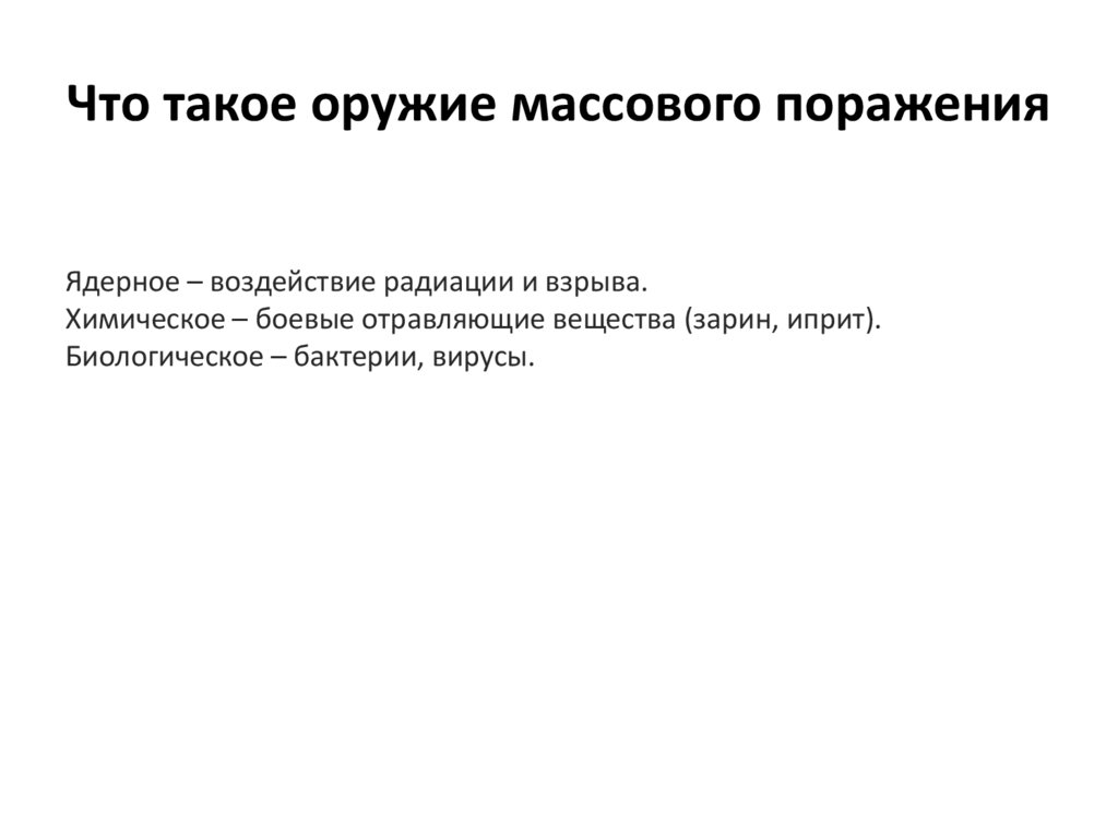 Что такое оружие массового пораженияЯдерное – воздействие радиации и взрыва.