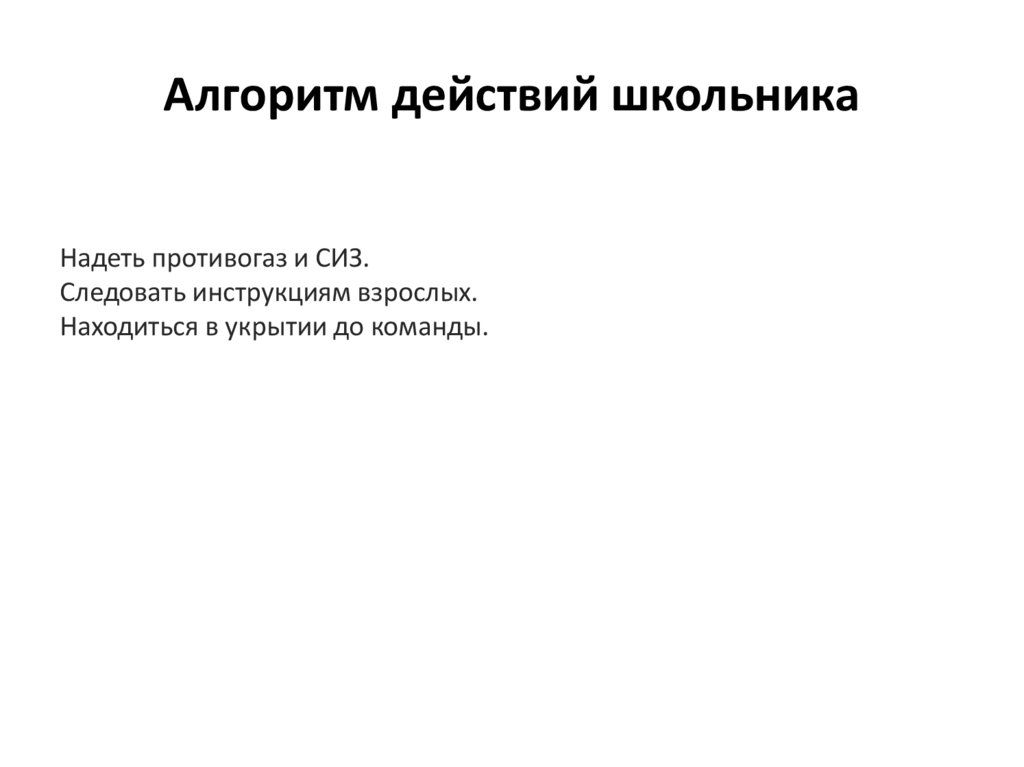 Алгоритм действий школьникаНадеть противогаз и СИЗ.