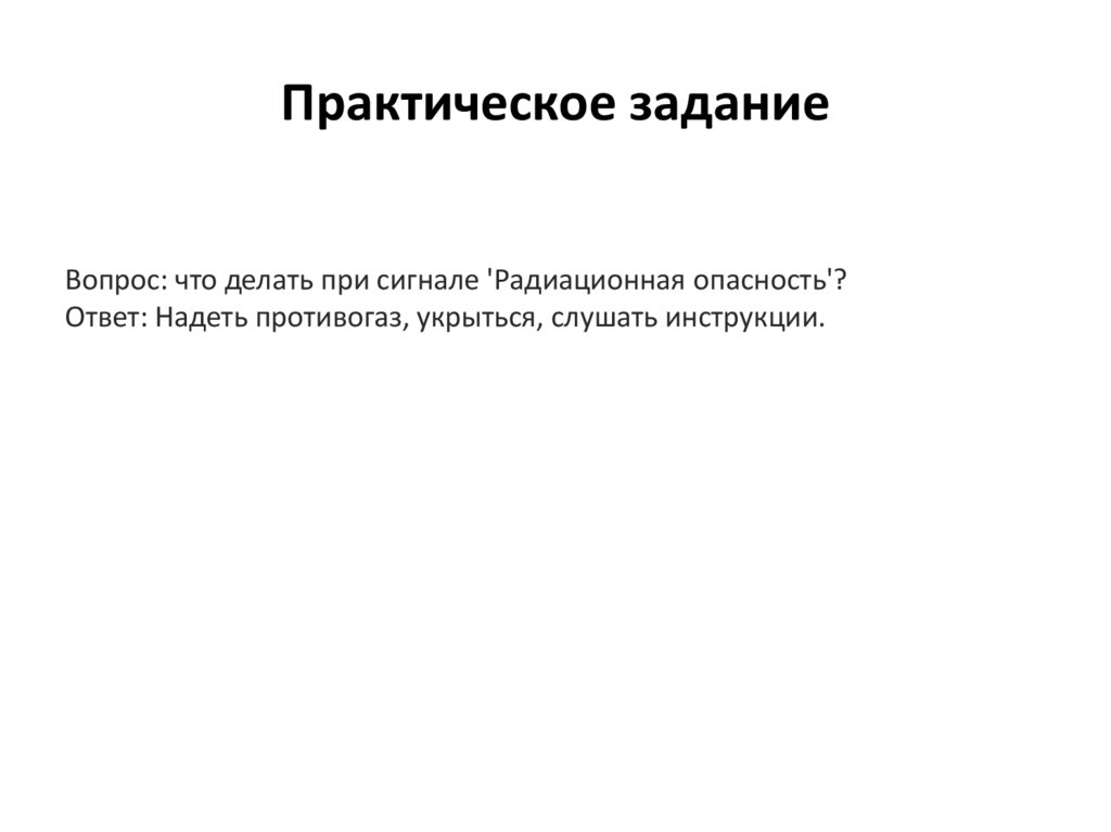 Практическое заданиеВопрос: что делать при сигнале 'Радиационная опасность'?