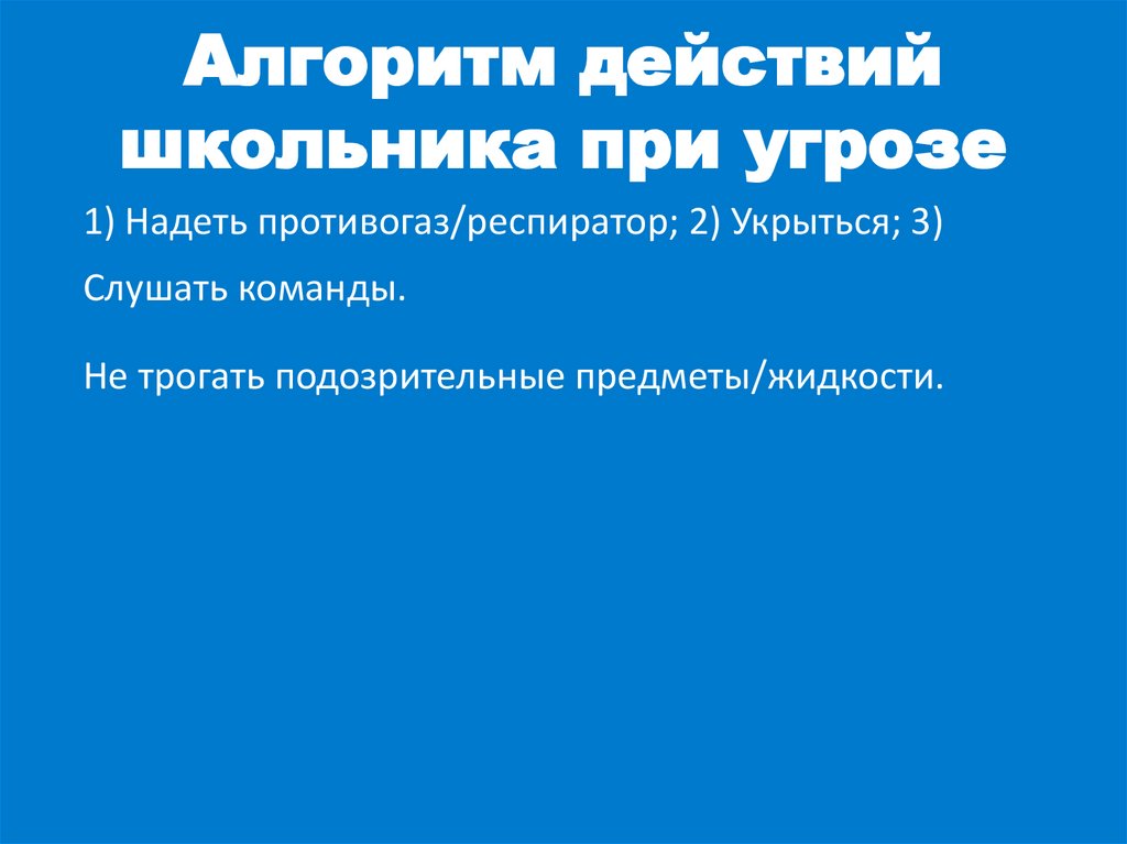 1) Надеть противогаз/респиратор; 2) Укрыться; 3)