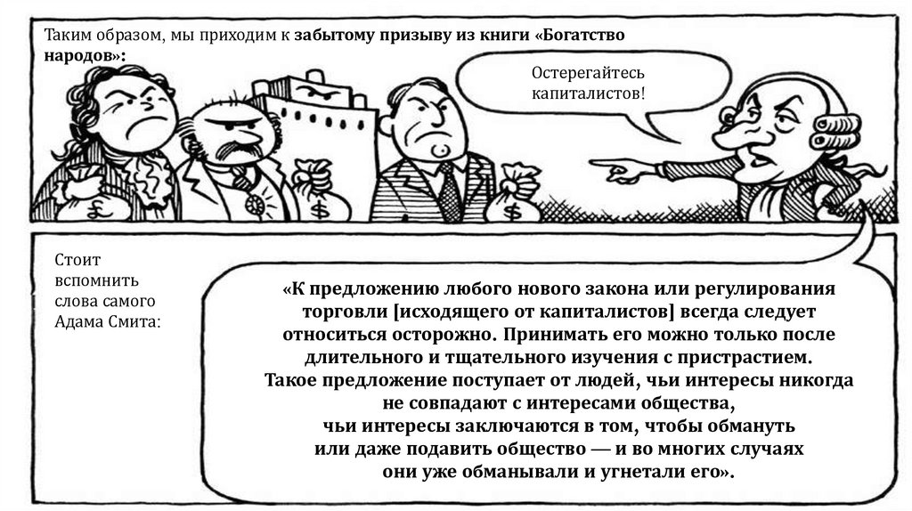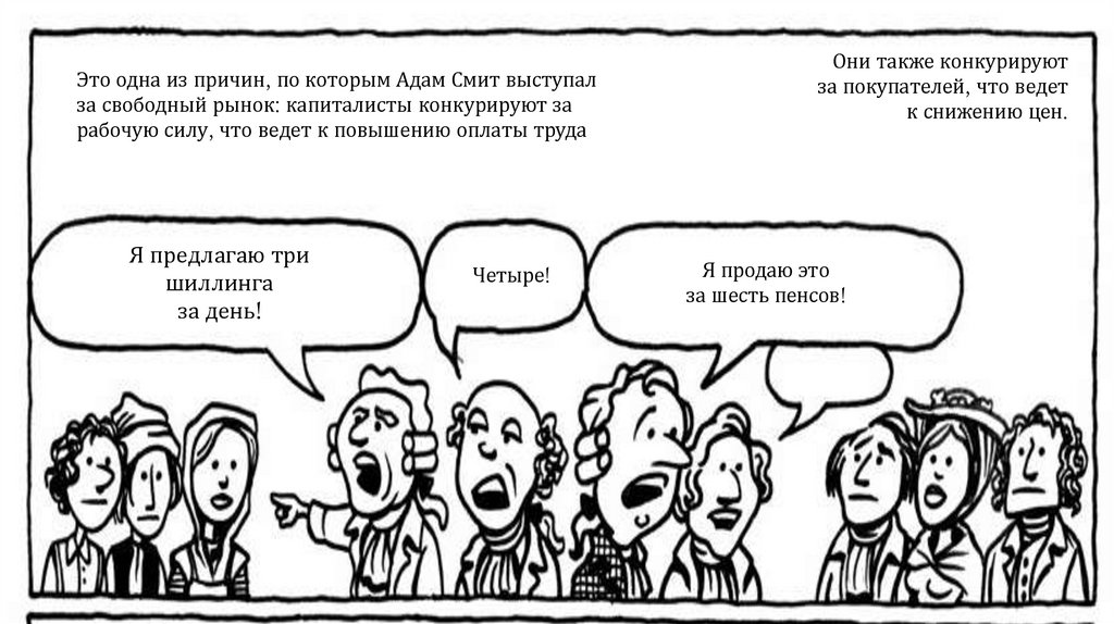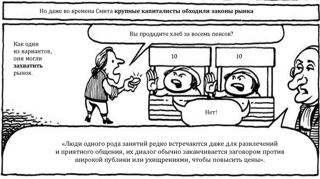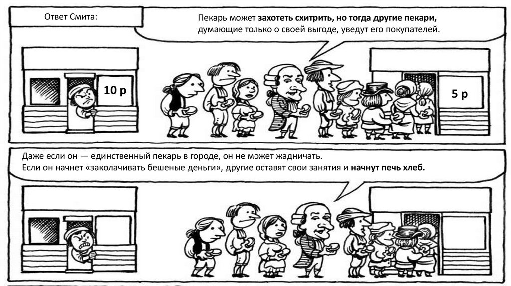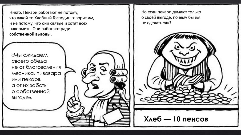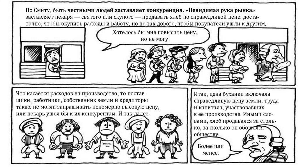По Смиту, быть честными людей заставляет конкуренция. «Невидимая рука рынка»заставляет пекаря — святого или скупого — продавать хлеб по справедливой цене: достаточно, чтобы окупить расходы и работу, но не так дорого, чтобы покупатели ушли к другим.