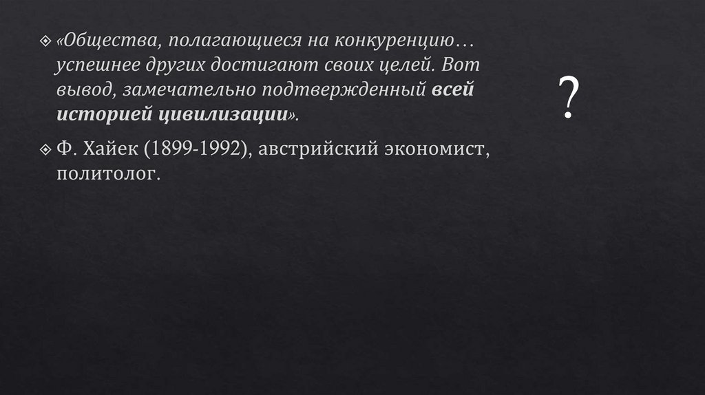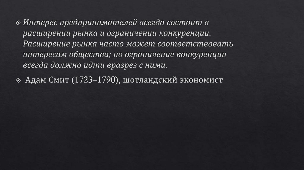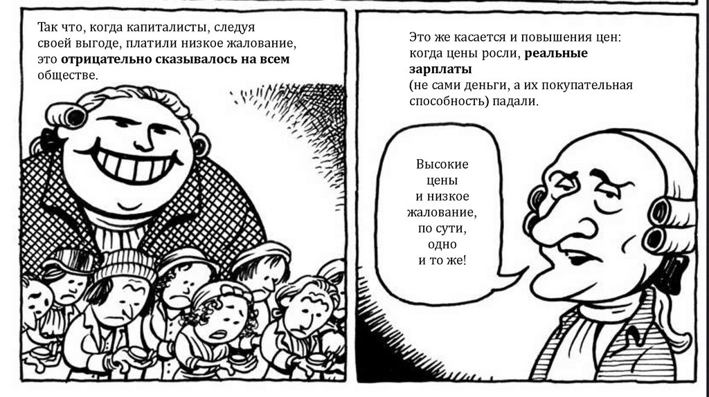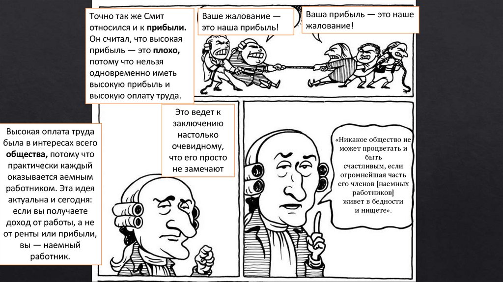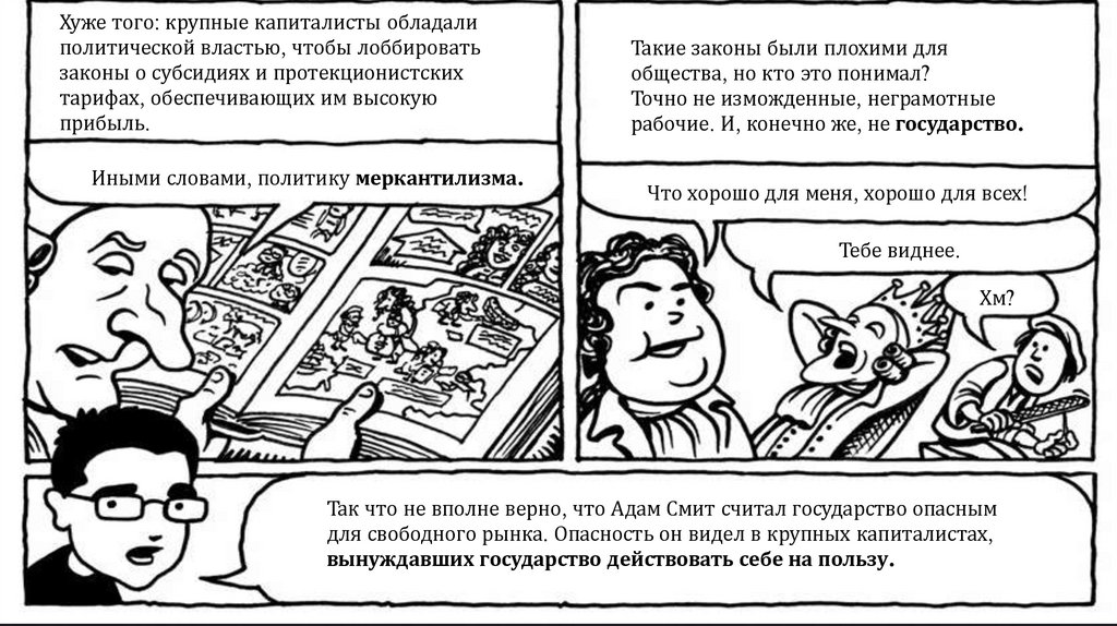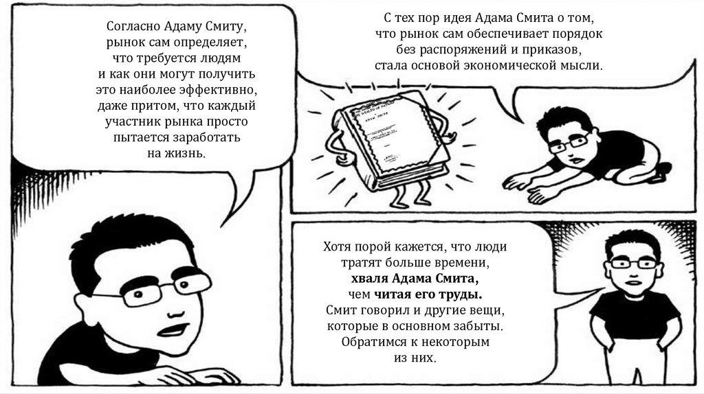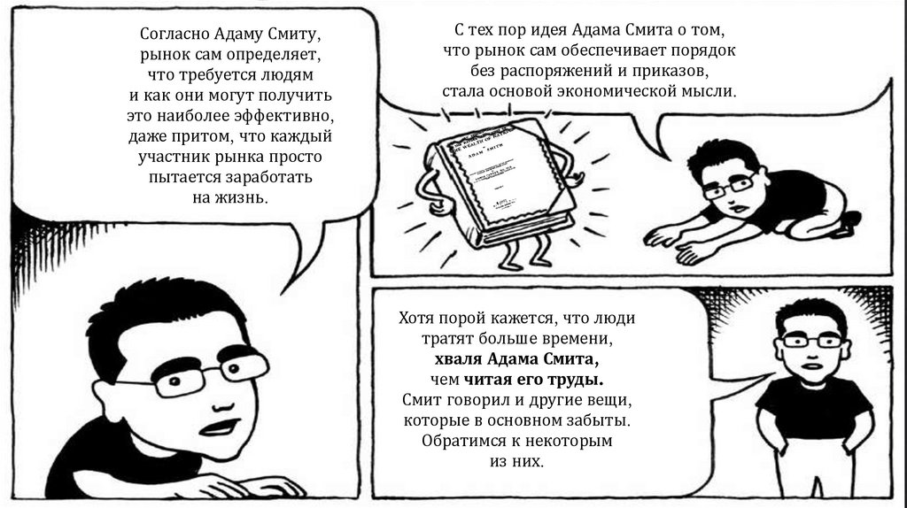 По Смиту, быть честными людей заставляет конкуренция. «Невидимая рука рынка»заставляет пекаря — святого или скупого — продавать хлеб по справедливой цене: достаточно, чтобы окупить расходы и работу, но не так дорого, чтобы покупатели ушли к другим.