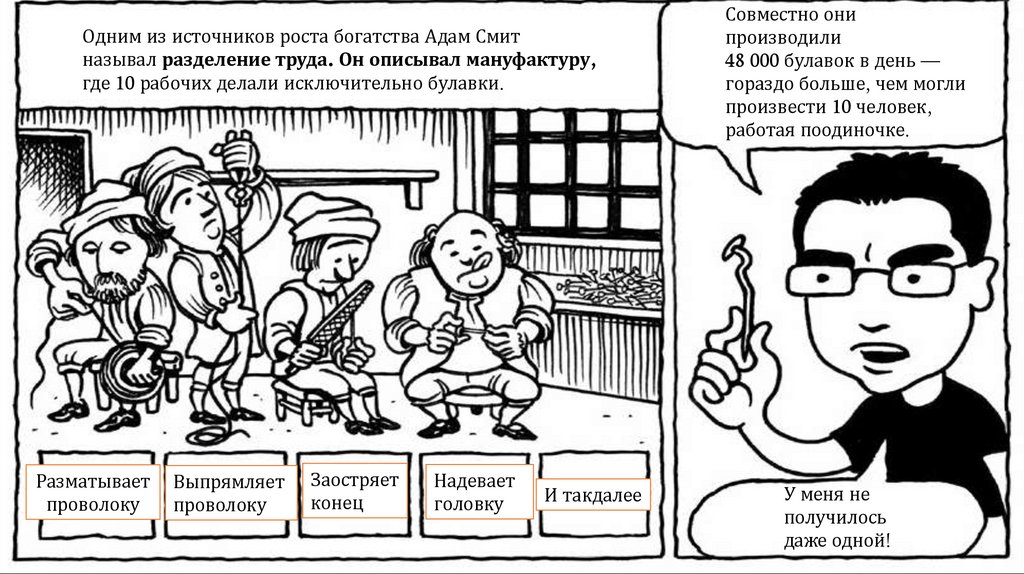 Одним из источников роста богатства Адам Смитназывал разделение труда. Он описывал мануфактуру,