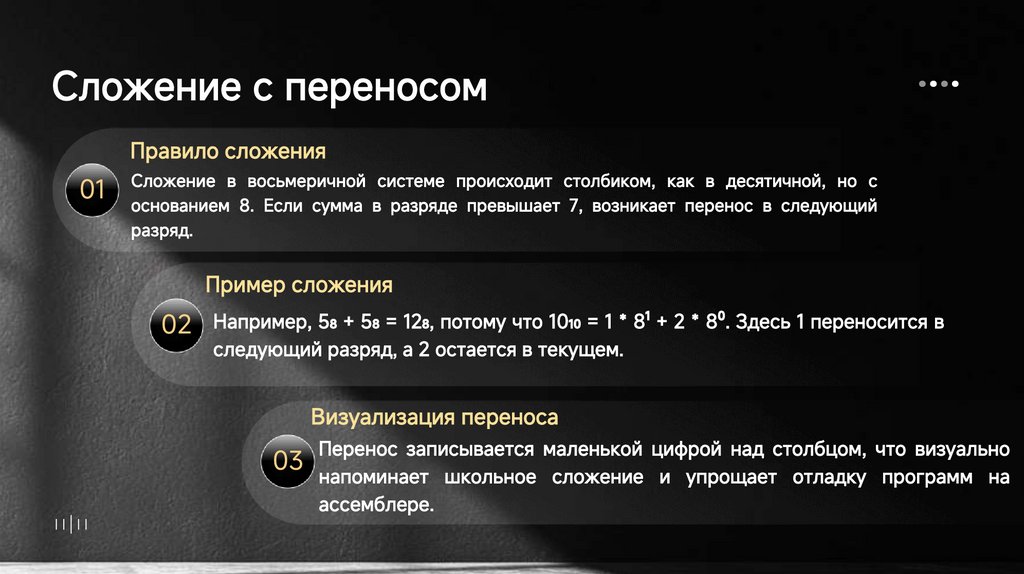 основанием 8. Если сумма в разряде превышает 7, возникает перенос в следующий