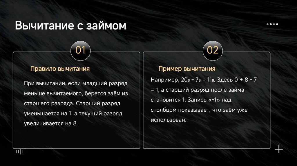 Например, 20₈ - 7₈ = 11₈. Здесь 0 + 8 - 7
