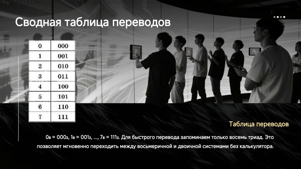 позволяет мгновенно переходить между восьмеричной и двоичной системами без калькулятора.