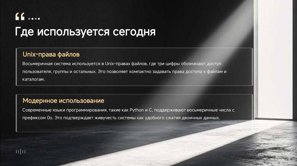 Восьмеричная система используется в Unix-правах файлов, где три цифры обозначают доступ