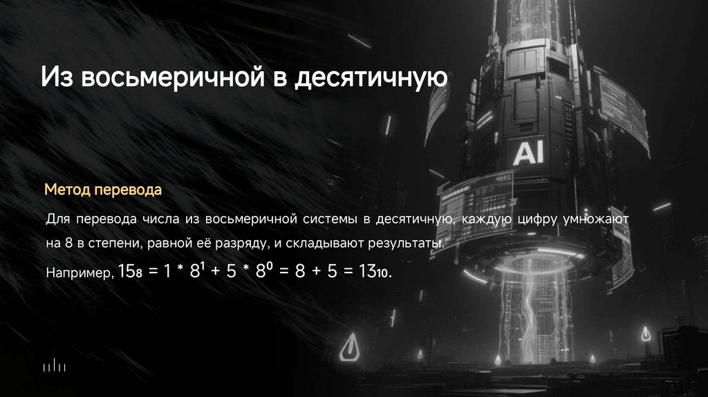 Например, 15₈ = 1 * 8¹ + 5 * 8⁰ = 8 + 5 = 13₁₀.