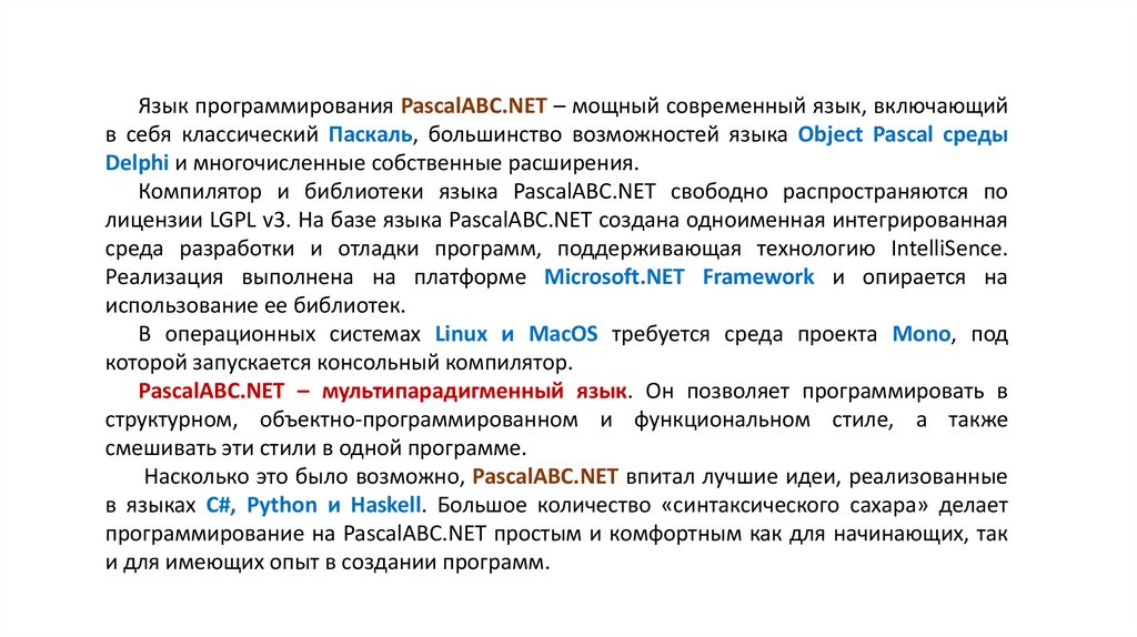 лицензии LGPL v3. На базе языка PascalABC.NET создана одноименная интегрированная