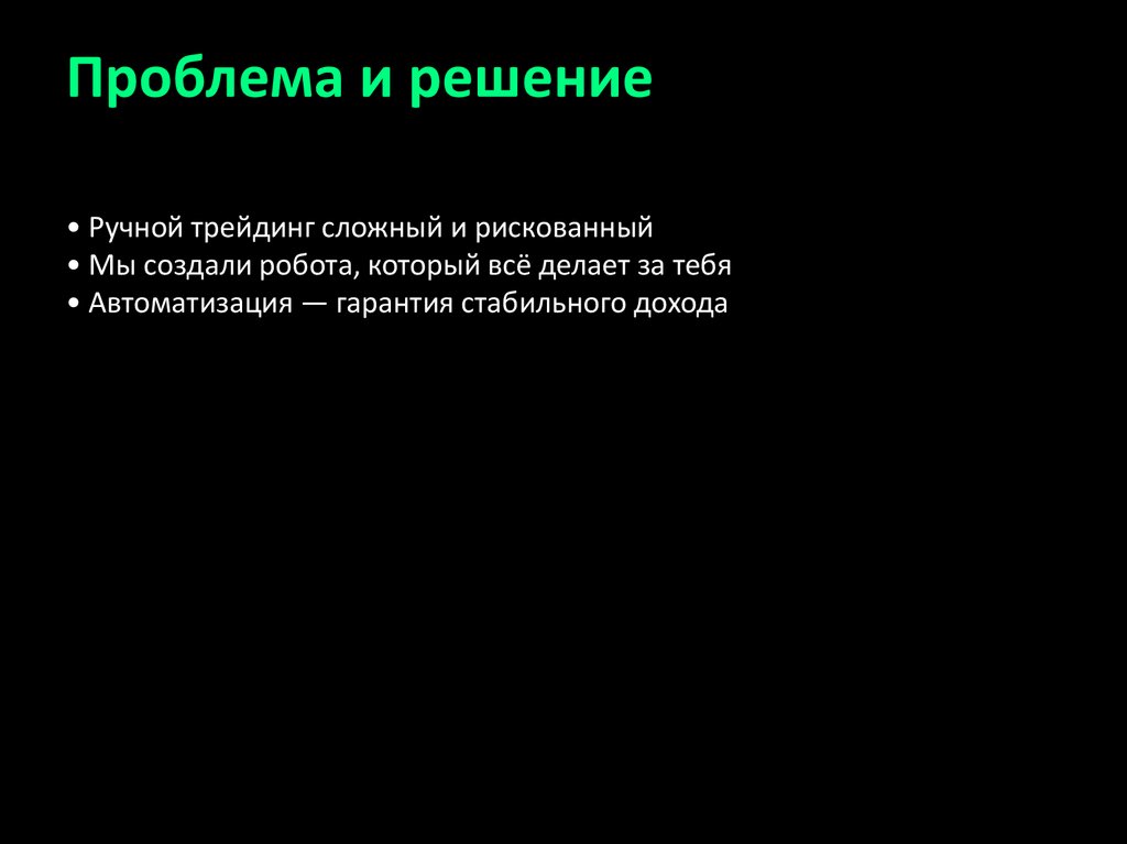 Проблема и решение• Ручной трейдинг сложный и рискованный