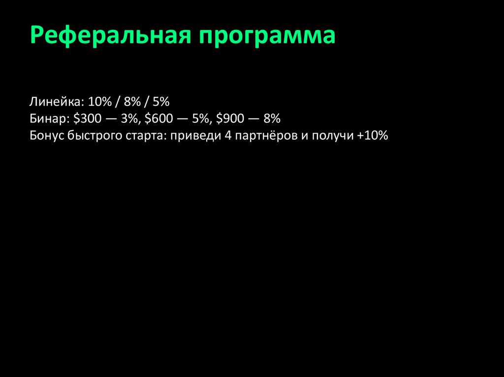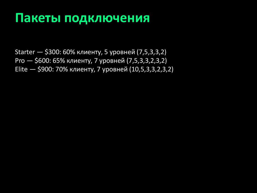 Пакеты подключенияStarter — $300: 60% клиенту, 5 уровней (7,5,3,3,2)