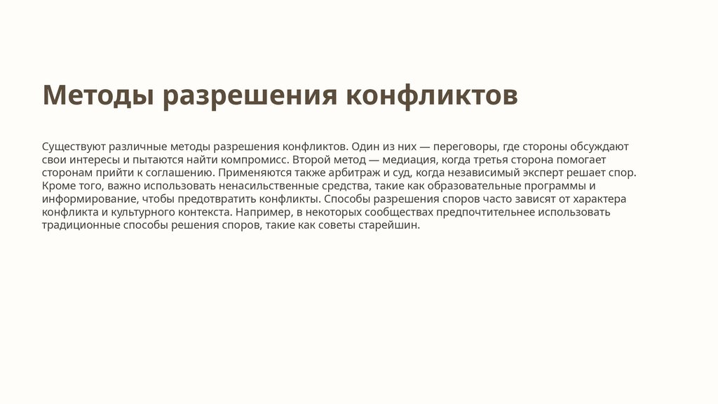 Методы разрешения конфликтовСуществуют различные методы разрешения конфликтов. Один из них — переговоры, где стороны обсуждают