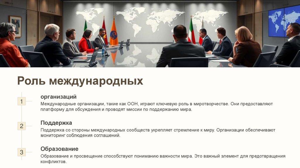 Международные организации, такие как ООН, играют ключевую роль в миротворчестве. Они предоставляют
