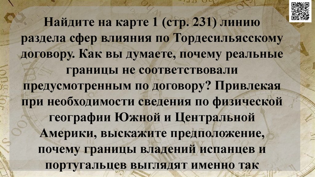Найдите на карте 1 (стр. 231) линиюраздела сфер влияния по Тордесильясскому