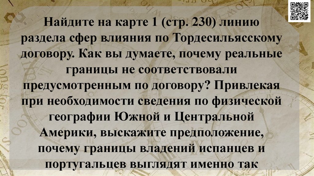 Найдите на карте 1 (стр. 230) линиюраздела сфер влияния по Тордесильясскому
