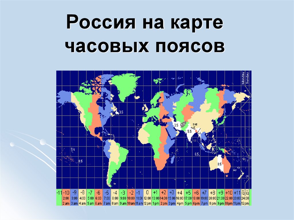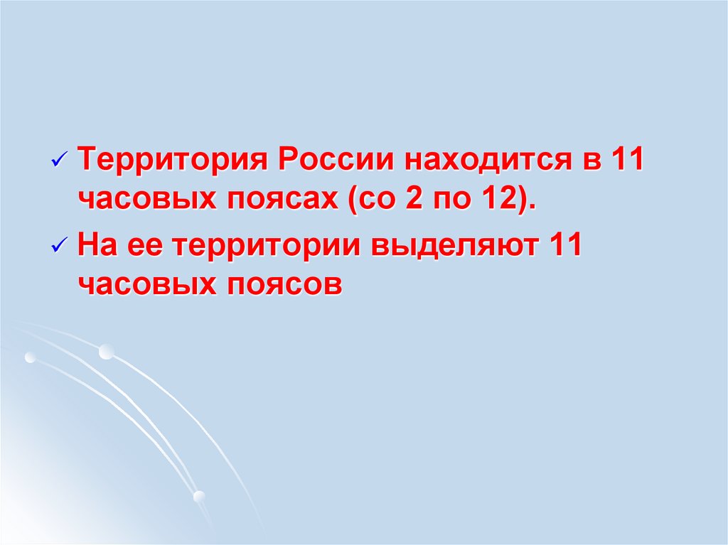 Территория России находится в 11часовых поясах (со 2 по 12).